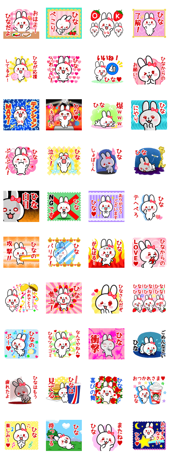 「ひな」ちゃん、「ひな」さんのための名前スタンプです。白いうさぎがかわいく気持ちを表現します。毎日よく使う言葉を集めました。よろしくお願いします♪
