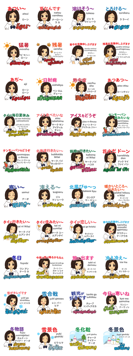 | スタンプ説明 | タイ語と日本語でタイ人と日本人が会話でよく使う夏と冬の言葉を選びました。ワンプッシュで円滑なコミュニケーション。タイ人と日本人が仲良くなるスタンプです。 |