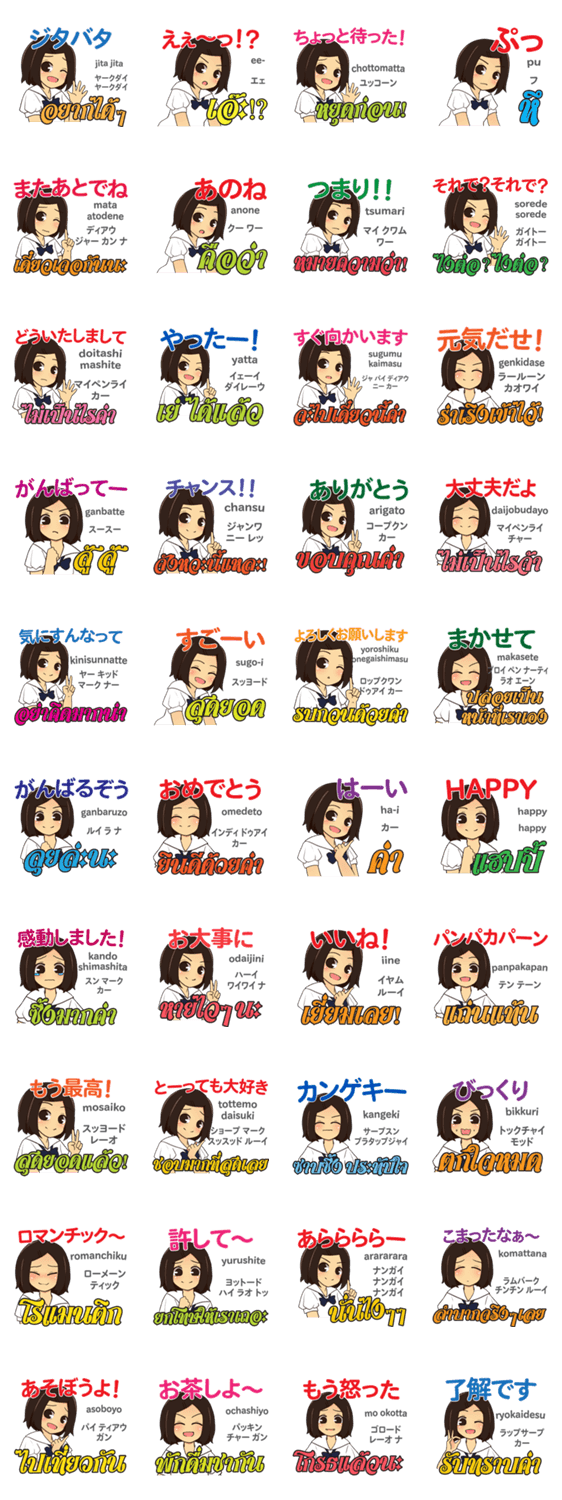 | スタンプ説明 | タイ語と日本語でタイ人と日本人が会話でよく使う言葉を選びました。ワンプッシュで円滑なコミュニケーション。タイ人と日本人が仲良くなるスタンプです。 |