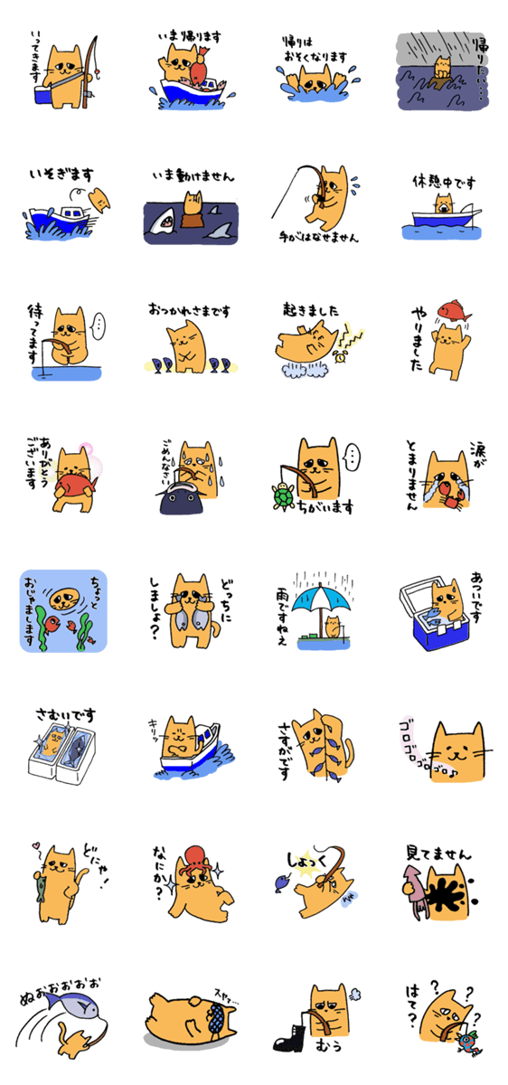 のんびりマイペースのたれめねこが魚釣りに行きました。 仕事や日常に使えるメッセージで、同僚、友達、家族、恋人との会話にどうぞ。ねこ好きさん、釣り好きさんにも。