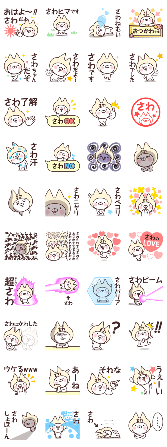 さわさん、さわちゃんが使える名前スタンプです。サワ/五和/佐和/佐波/佐羽/咲和/咲笑/咲羽/咲花/幸和/彩和/彩羽/彩葉/沙和/沙羽/爽/砂羽/紗和/紗波/紗羽/紗葉さんはぜひ。