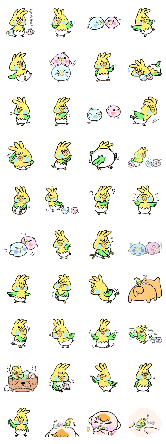 スタンプ説明 インコのチュン之助でちゅ。弟のピ郎と妹のピ代が、いつも一緒でちゅ。毎日少しずつ、ご主人様の言葉を覚えているでちゅ。一生懸命頑張りまちゅ!