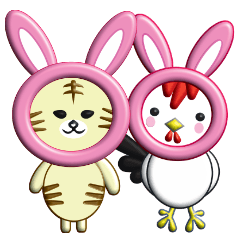 スタンプ説明 強がりな寅が、本音を伝えるため「うさぎ」に変身!それを見た干支仲間も着ぐるみで大集合した、ほっこりシュールなスタンプです。