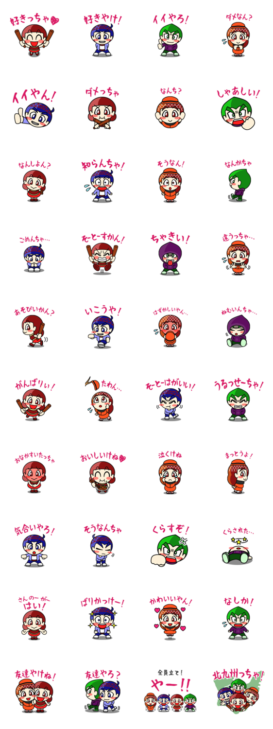 スタンプ説明 福岡県北九州市の方言スタンプ第1弾!北九州の各区を擬人化したご当地キャラクター・こくらちゃん・わかとくん・やはたくん・もじこちゃんと北九州弁でトークしよっちゃ!