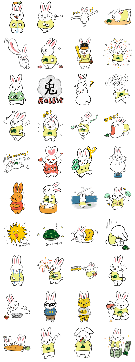 スタンプ説明 ちょいとぽっちゃりマシュマロラビットのうさどんと、相棒のかめくんがあなたの毎日をいっぱい、もりあげるど〜〜〜ん♪ らびっつ!