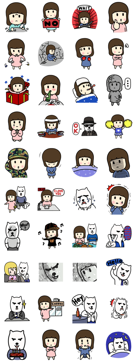 スタンプ説明 可愛くて スウィートな少女「ヨミ」と自分が人間だと思っている浮気者わんこ「ジン」。彼らの猟奇で生き生きしたスタンプを楽しもう!