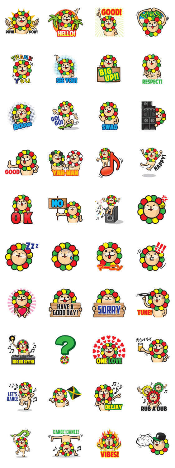 スタンプ説明 ジャマイカ生まれ日本育ち、レゲエ好きにはたまらないラスタカラーのラガライオンのスタンプ登場!レゲエの現場で使われる合図や言葉、普段の日常会話を収録!