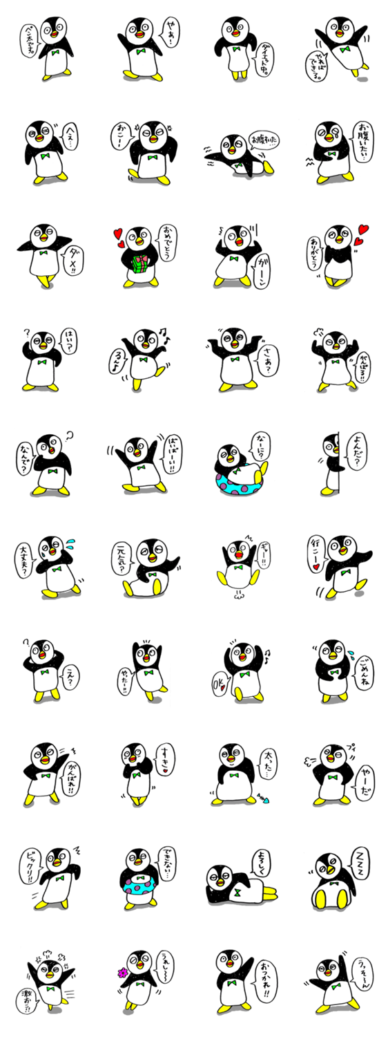 スタンプ説明 おしゃべり大好きペンギンのペン太です。緑の蝶ネクタイが彼のチャームポイント。