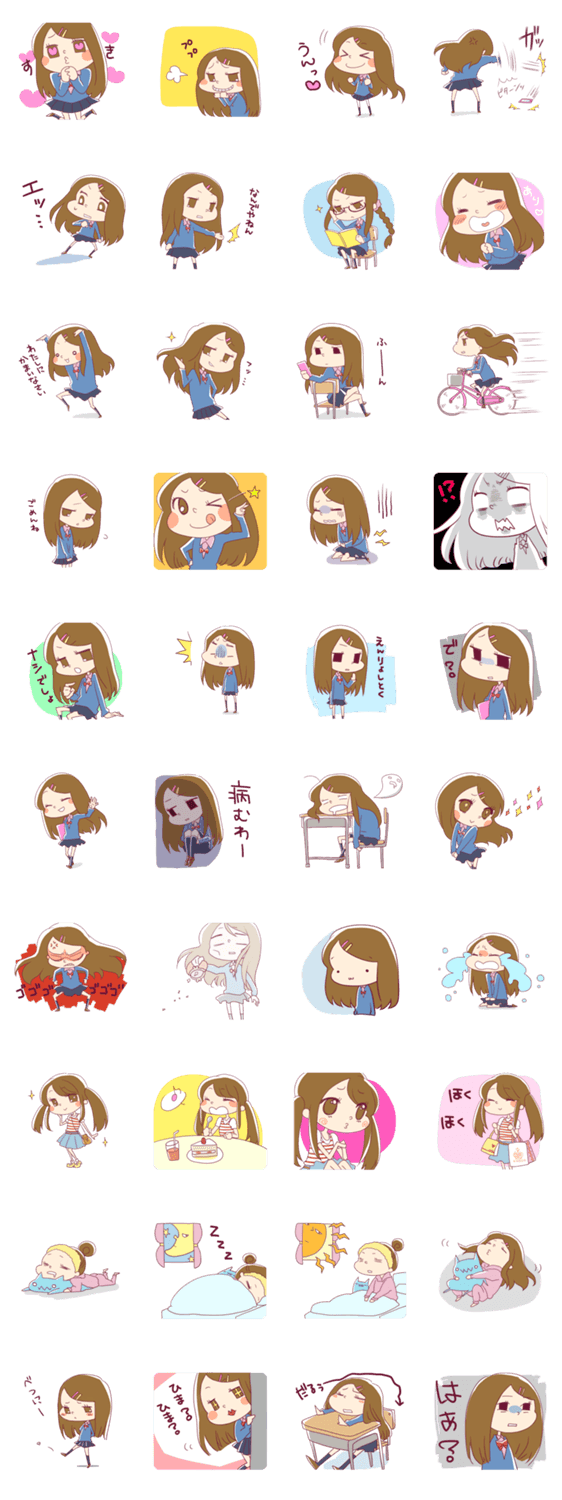 スタンプ説明 LINEの中心ユーザーである女子高生が普段よく使う言葉や心の中を可愛らしく面白く描きました。