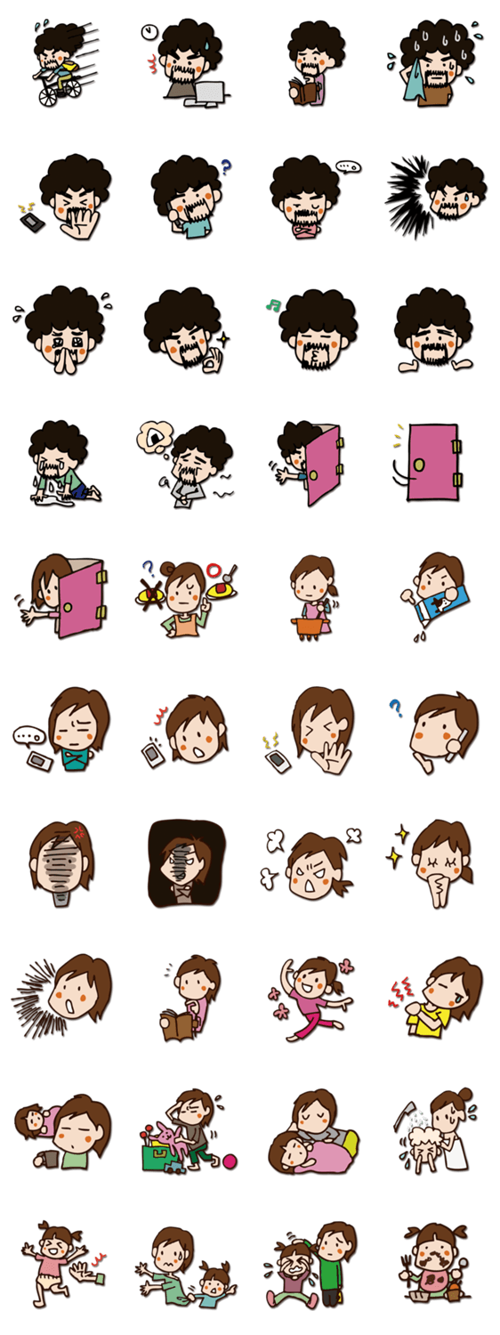 スタンプ説明 第3弾はアフロのハニーとmissaと娘です。仕事で忙しい旦那様と育児で忙しい奥様のコミュニケーションに使ってもらえたらとても嬉しいです。
