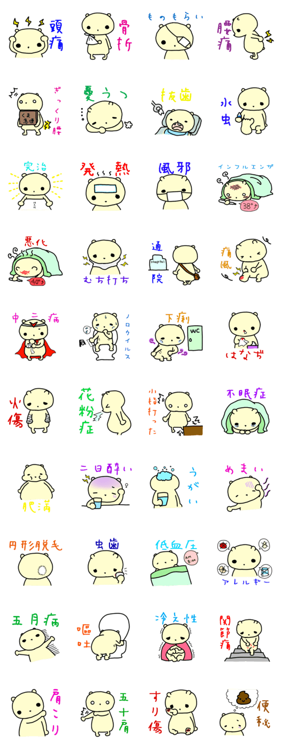スタンプ説明 病気にばかりなるくまです。病気になった時はこのスタンプをポン!