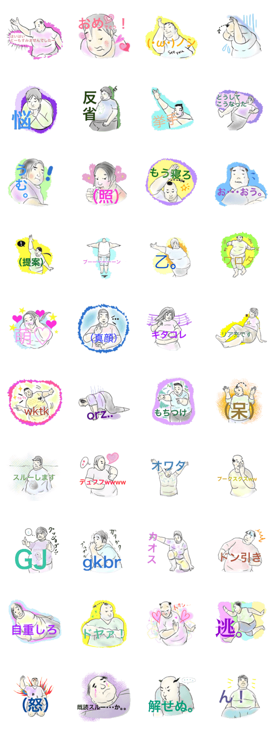 スタンプ説明 小太りの個性的な髪型のキモカワヲタ系の「おっさんさん」達が、ほんのり簡単なネット用語を操ったり操らなかったりしながらスタンプになっているようですよ。