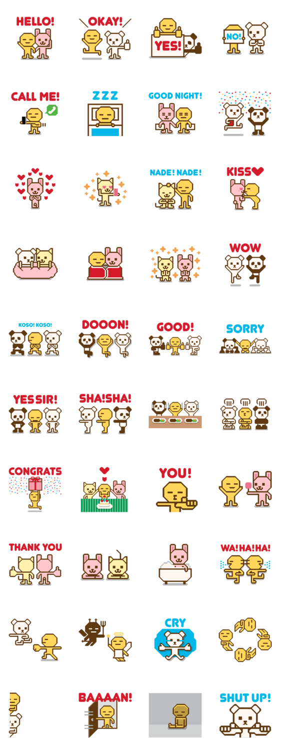 スタンプ説明 ドットマンシリーズの第一章~カクカクイラスト編~DOTMINIとカワイイ動物の日常の喜怒哀楽を表現したスタンプです!ラブラブラウン!