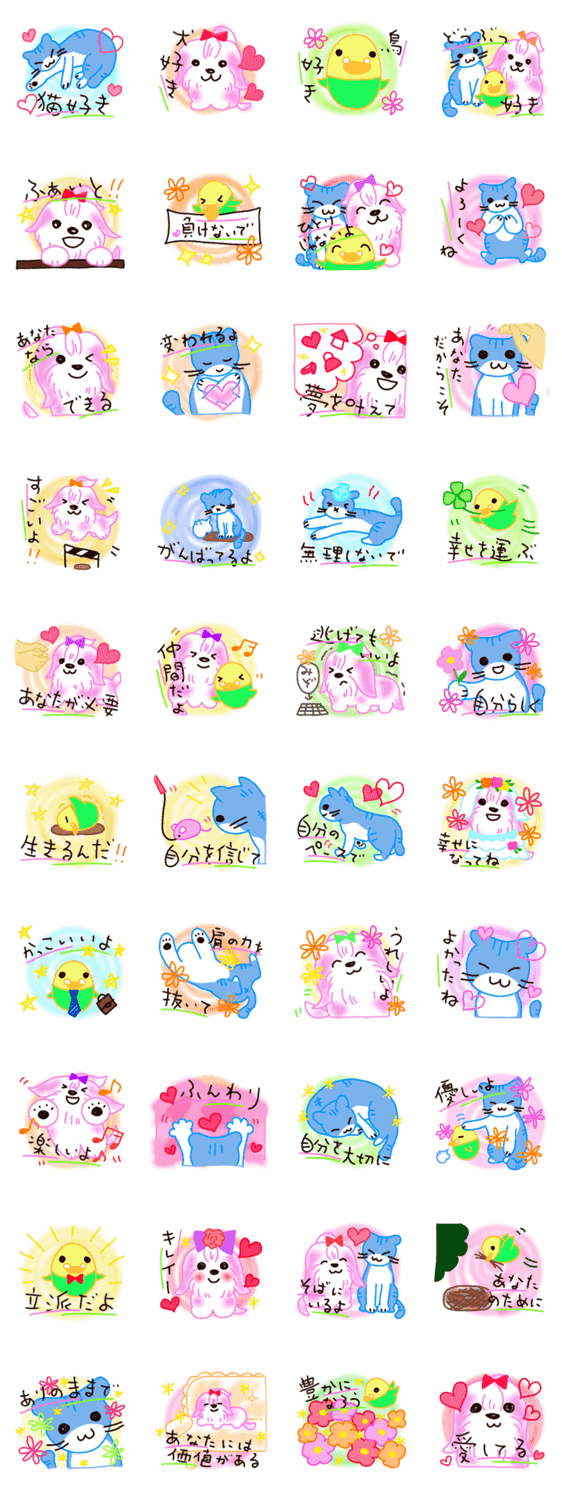 猫、犬、鳥、動物好きの皆様に贈る、希望の励ましスタンプです。「たんぽぽ色のピースケ」もいるよ。