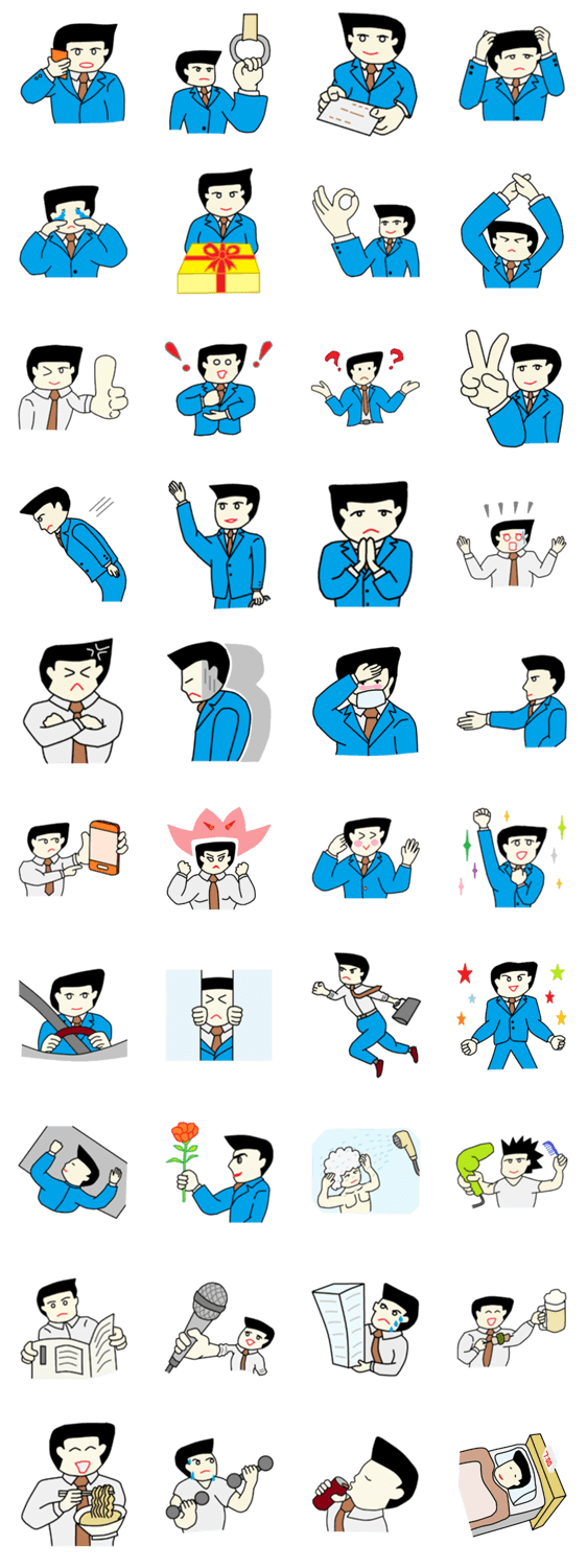 スタンプ説明 ごく普通のサラリーマン。でも、心の奥に秘めた野心はナンバーワンを目指すガッツのある奴。ガンバルあなたを応援するスタンプ。