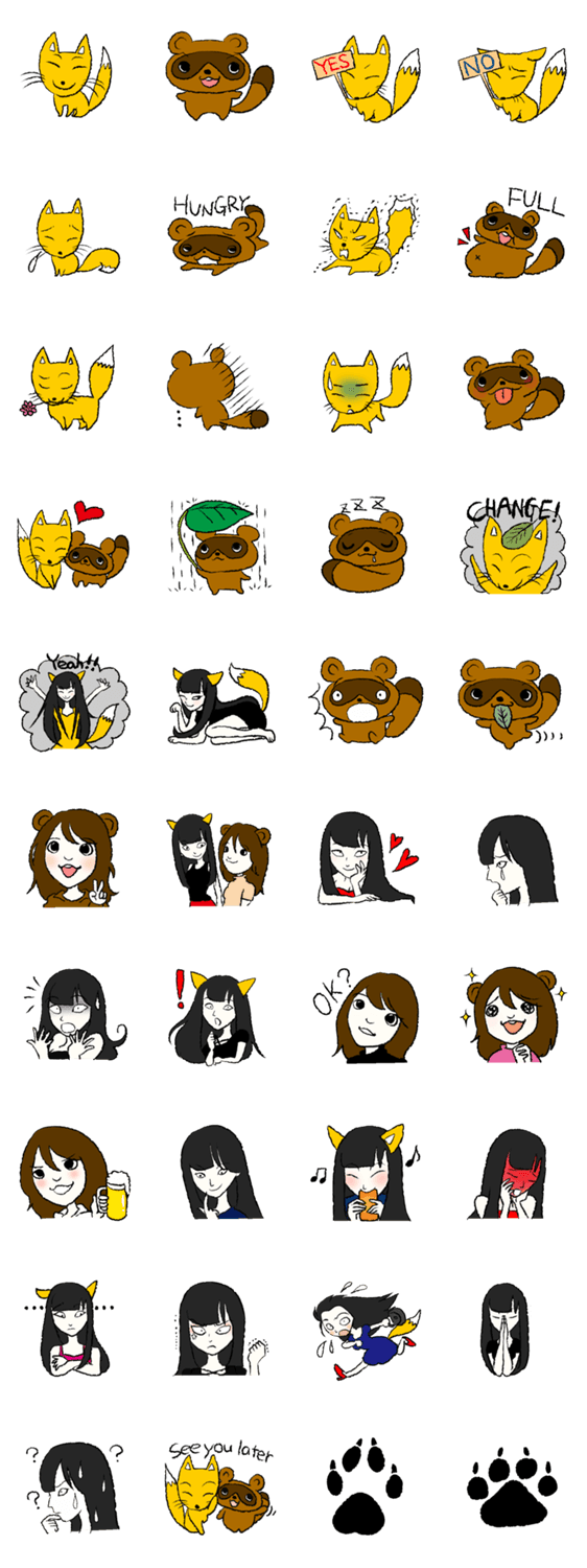 スタンプ説明 仲良しのキツネちゃんとタヌキちゃんは人間に化けるのが大好き!油断すると耳や尻尾がピョッコリ!ばれないように気をつけてね!