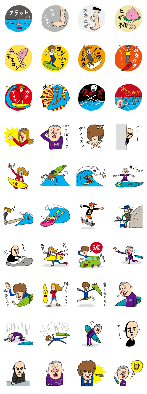 スタンプ説明 サーファー専用スタンプ。波コンディションをはじめ、あなたの行動や感情を、仲間たちとダサい感じに情報共有。あなたのサーフィンライフをさらに充実させます。