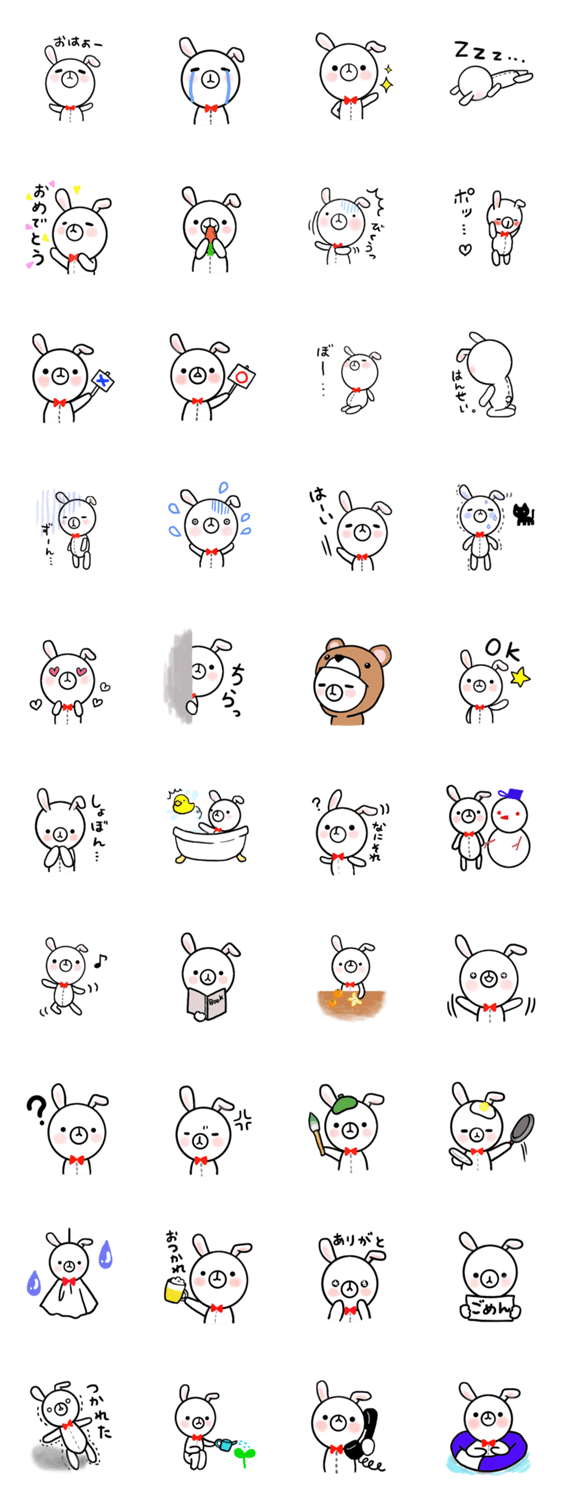 スタンプ説明 ぬいぐるみのうさぎさんです。かわいい赤い蝶ネクタイがお気に入り。端から見るとゆるいけど…おしゃれ、ダンディーがモットー。これぞ兎魂。