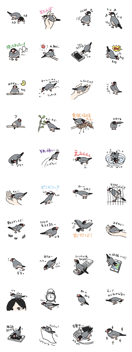 スタンプ説明 桜文鳥チャッピーのスタンプ第二弾です。スマホと文鳥のコラボなど、更にトークで使いやすくなりました。