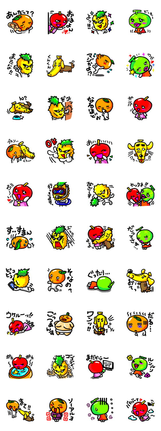 スタンプ説明 楽しいフルーツの仲間たちがトークをさらに盛り上げるよ!オレンヂ、アップルン、パイナポー、バナワン、メロミンが大活躍!