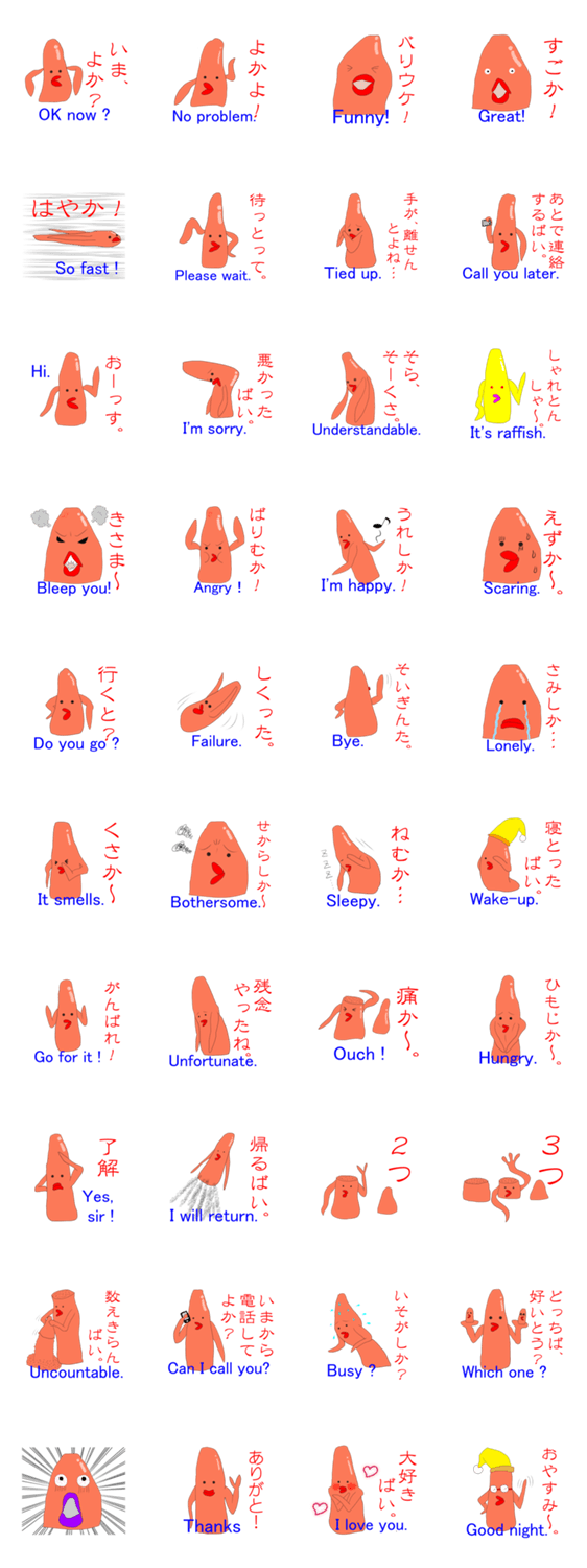 スタンプ説明 福岡の博多弁を中心に、九州の方言をしゃべるメンタイコのキャラ。実用的な言葉を厳選しました。なぜかにくめない、ゆるキャラメンタイコです。英語にも対応。