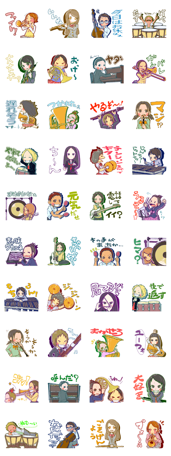 スタンプ説明 吹奏楽部のメンバーが色んな楽器を持ったスタンプ!好きな楽器を探してみよう。