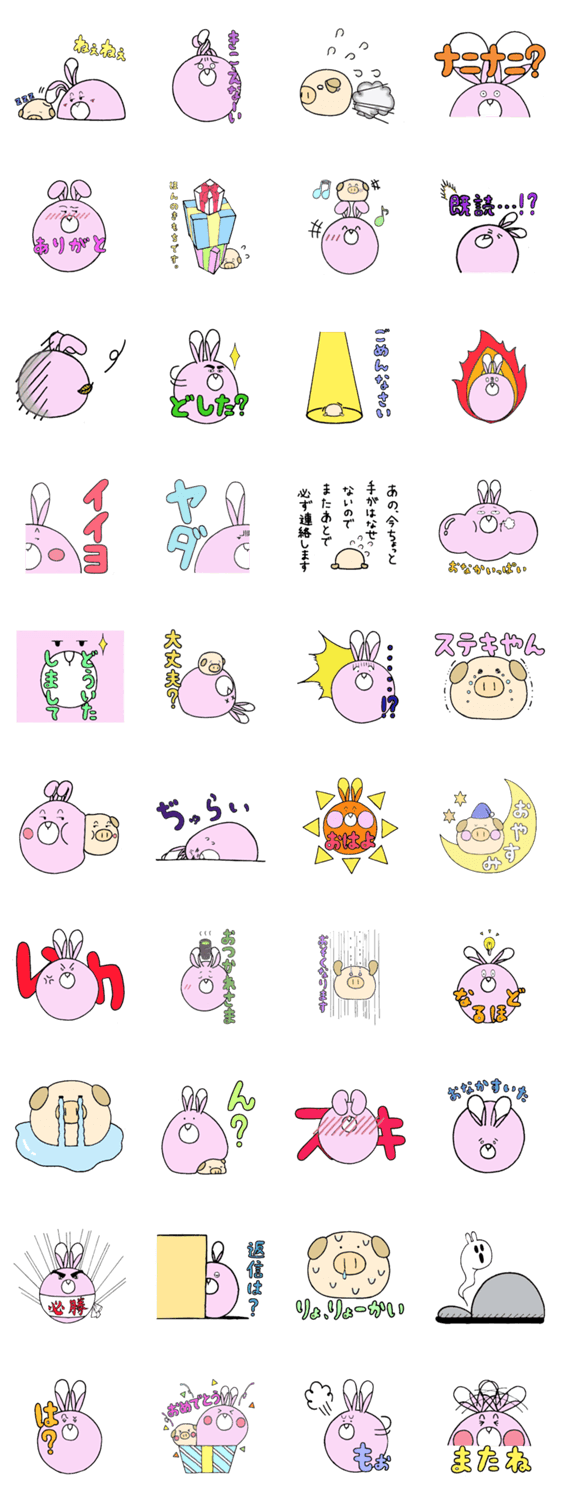 スタンプ説明 わがままでえらそう、でも実はちょっとツンデレなうさぎ。そんなうざきに振り回されて、しいたげられちゃうぶたさん。凸凹なふたりの相性はピッタリ。とっても仲良しです。