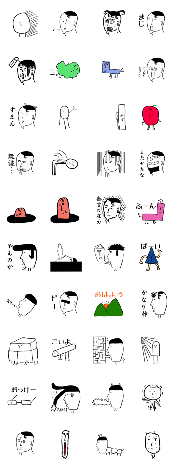 スタンプ説明 シュール。たけし。よしこ。へんないきもの。りんご。生活。