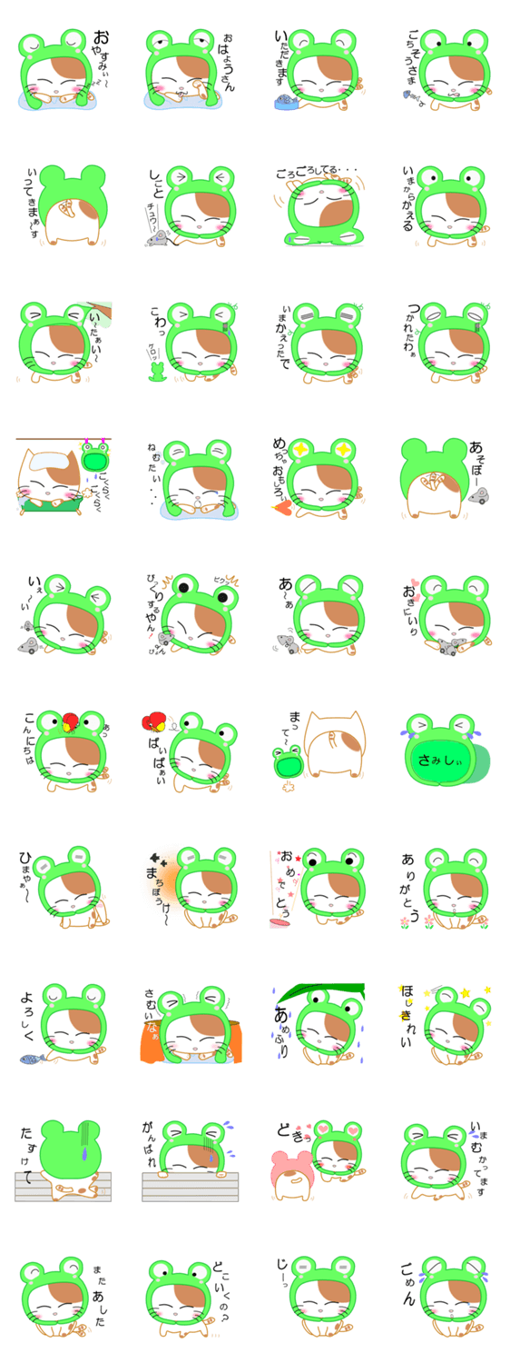スタンプ説明 カエルのケロと、無表情な猫 にゃんが過ごす楽しい日常をスタンプにしました。