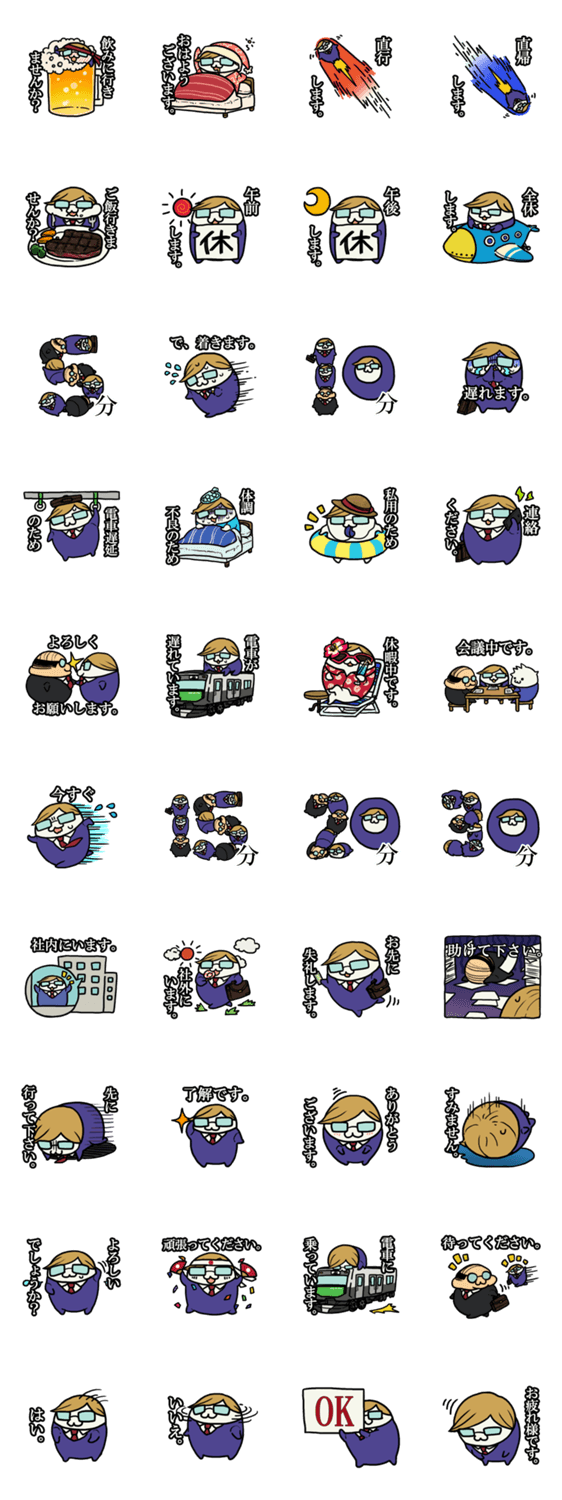 スタンプ説明 仕事が忙しくて返事を入力する時間も惜しい。でも伝えることはしっかり伝えたい。そんなサラリーマンにおすすめのスタンプ。