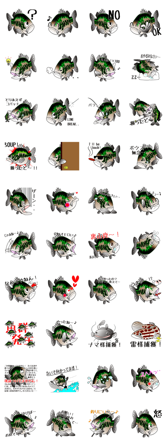 スタンプ説明 ルアー釣り、ブラックバスのラージロウくんスタンプです。釣りに関する専門用語を盛り込みました。ルアー・ライギョ・ナマズなど。釣り会話にお役立て下さいね。