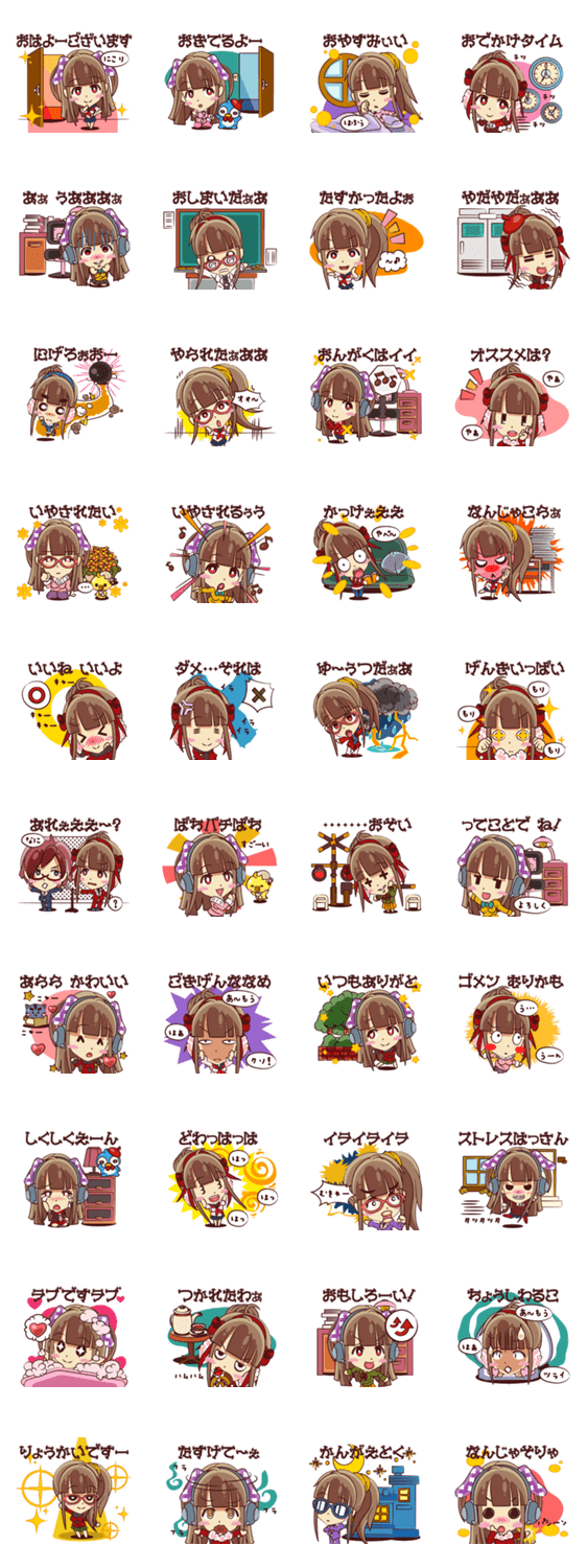 スタンプ説明 テーマ別に日常を盛り上げてくれるアニメ漫画タッチの色々なキャラクターを集めてみました。今回は音楽好きで日々癒やされたい学生の女の子。