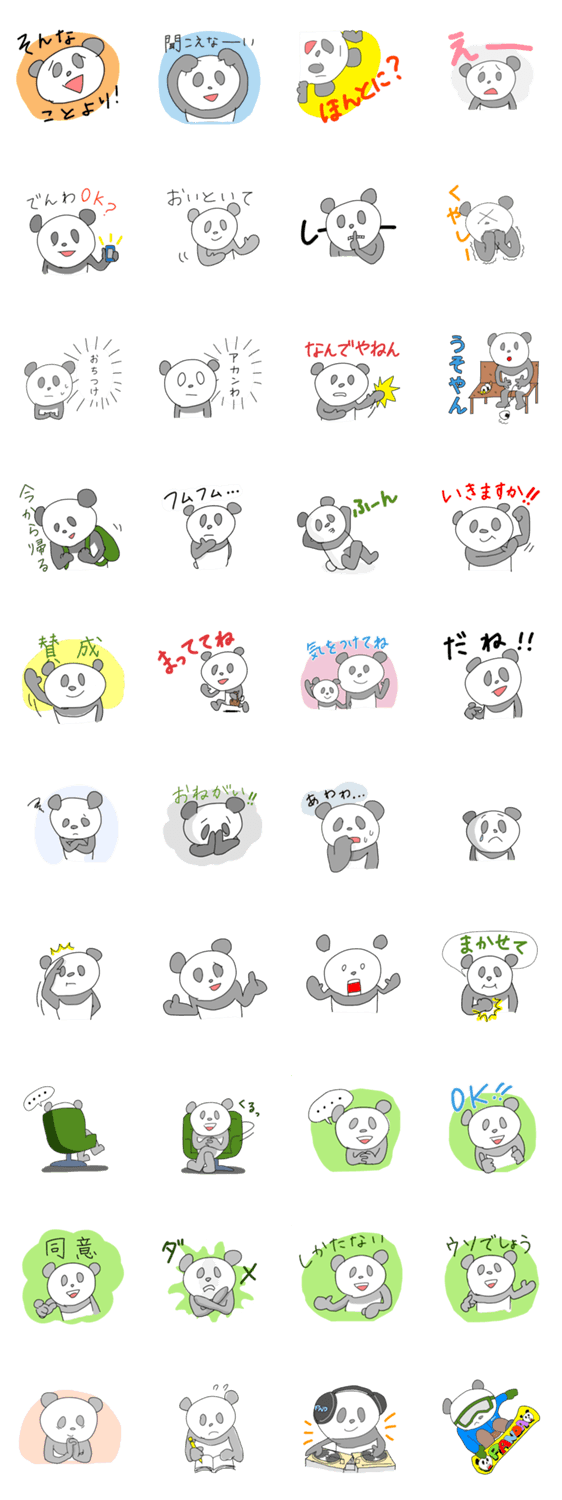 スタンプ説明 パンダの世界の住民達です。おもしろカッコかわいいパンダ達です。DJやスノーボードをし、関西弁も話せます。