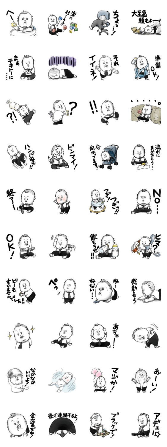 スタンプ説明 赤ちゃんだって仕事します。サラリーマンのまねをする赤ちゃんのスタンプです。シュールでかわいい赤ちゃんのギャップで癒されてください。