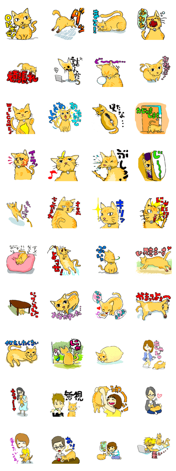 スタンプ説明 美術大学生たちと暮らす、人気者「シェアハウス猫きゃん」。たくさんの要望に応えてスタンプになりました。日々の愛くるしい表情と、住人たちとのひとコマを収録。