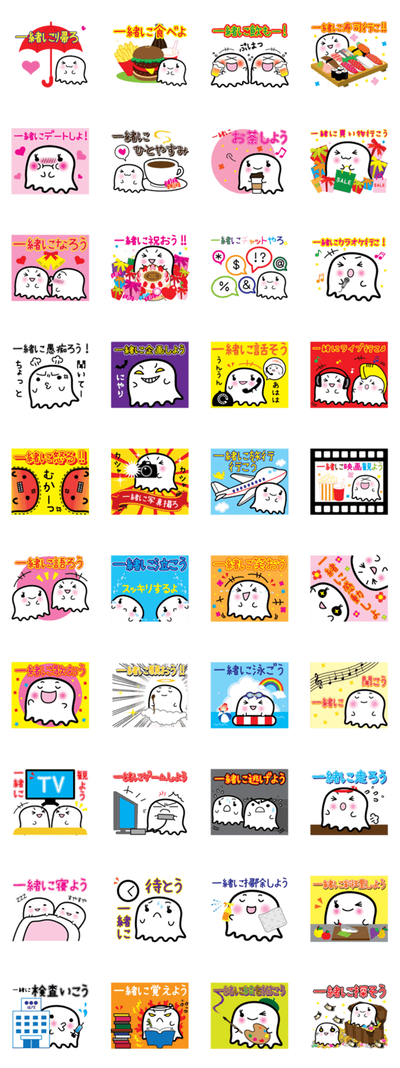 スタンプ説明 とっても可愛い「おばけのよっち」の「一緒に〜編」スタンプです。さまざまな表現が目白押しで、使いやすさバツグン。よっちを使って友達を誘ってみよう。