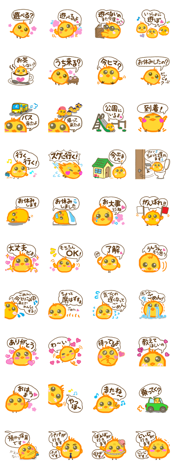 スタンプ説明 幼稚園や学校生活でよく使用する一言を、キュートで可愛いヒヨコが伝えます。ママ友達とのコミュニケーションに!セリフ入りふきだしで、気持ちをお手軽に伝えられます!