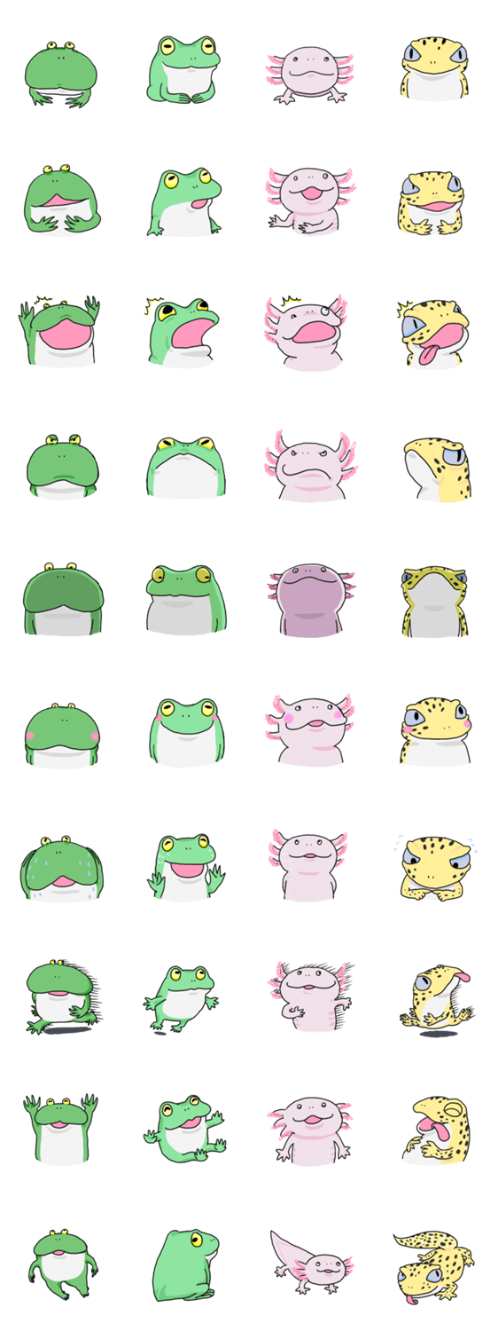 スタンプ説明 二匹のカエル、ウーパールーパー、ヒョウモントカゲモドキのスタンプ。