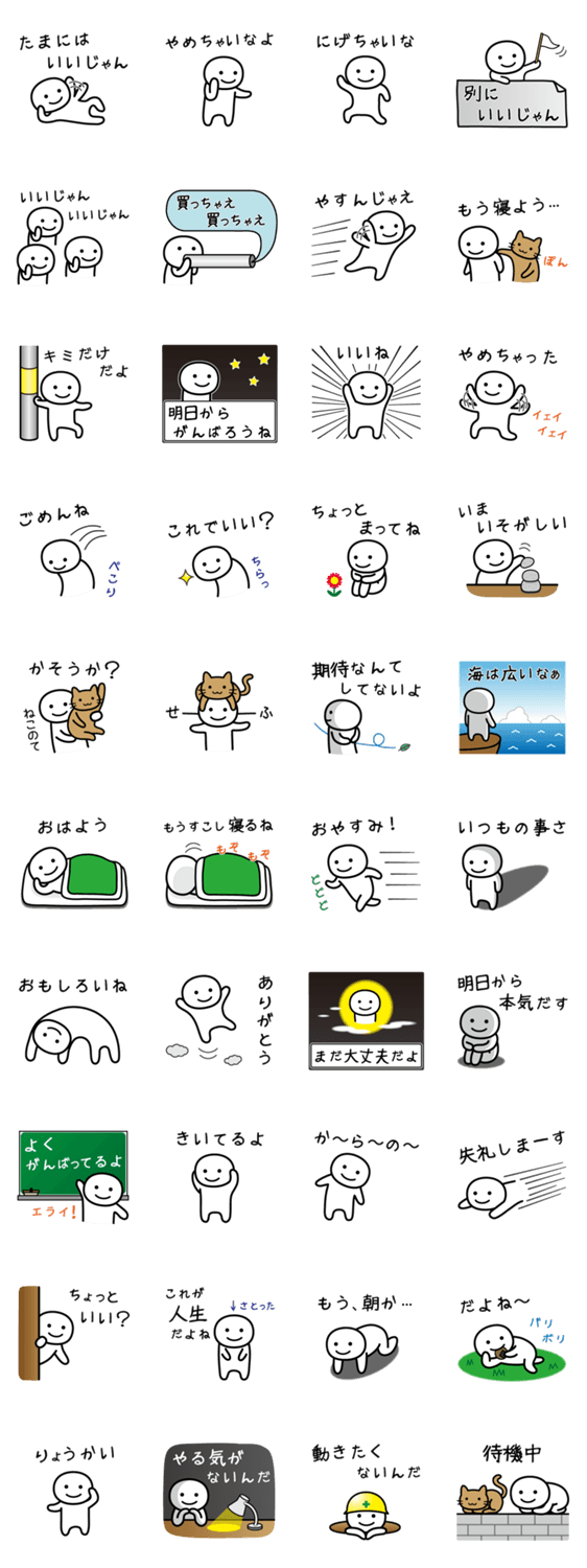 スタンプ説明 日頃、頑張りすぎのあの人を「別にいいじゃん」と甘やかしてあげましょう。自分にも相手にも、ちょっと甘い所があるシンプルなスタンプです。所々、ねこもいます。