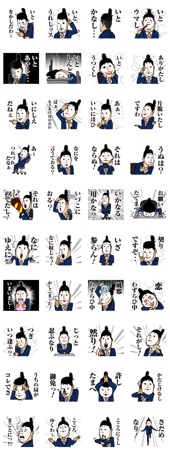 スタンプ説明 公家リーマン。それは、サラリーマンの姿をした公家。古語と現代語が融合した言葉遣いであなたのキモチを、いとをかしく伝えます。