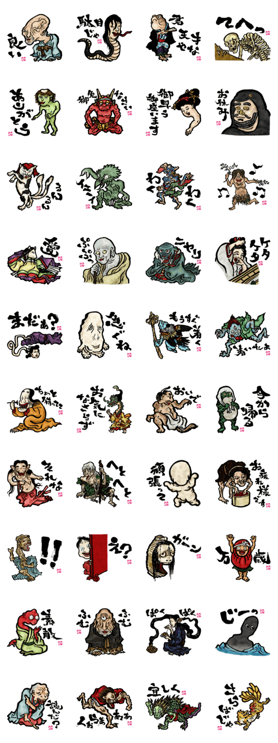 スタンプ説明 既読のまま返信が来ないのはひょっとして妖怪の仕業かも?いたずら好き、だけど憎めない、すぐ身近に潜む妖怪達がスタンプとなりて大集合!