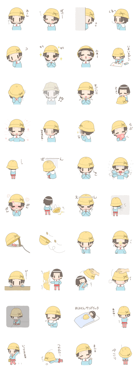 スタンプ説明 お気に入りの帽子がだいすきな女の子。帽子のゴムひもをついつい食べてしまいます。
