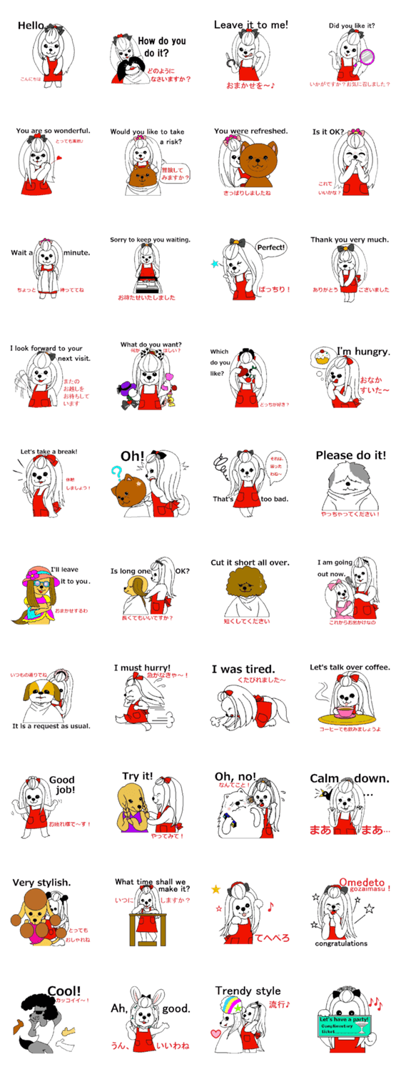 スタンプ説明 マルチーズの雛ちゃんが、美容師さんになってお喋りします。今日はどんなお客さんがやってくるかな?