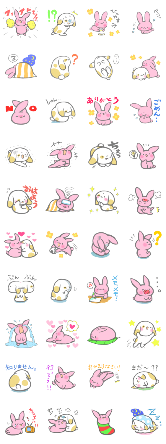 スタンプ説明 ゆるっとまったりした生活を送る、仲良しうさぎたちの日常で使えるスタンプです。ゆるっと使ってね♪