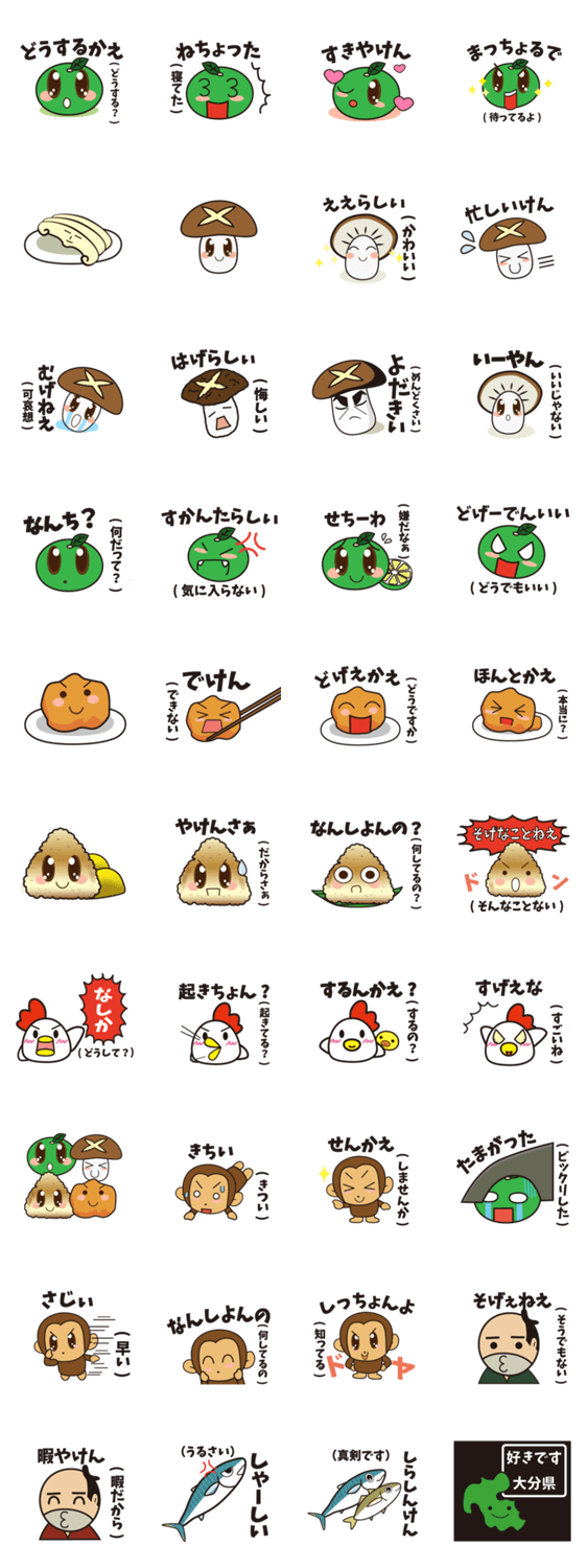 スタンプ説明 大分名物を可愛くスタンプにしてみました。大分の特産物が盛り沢山!大分弁+方言の意味もついているので、言葉を知らない人にも送ることができます。