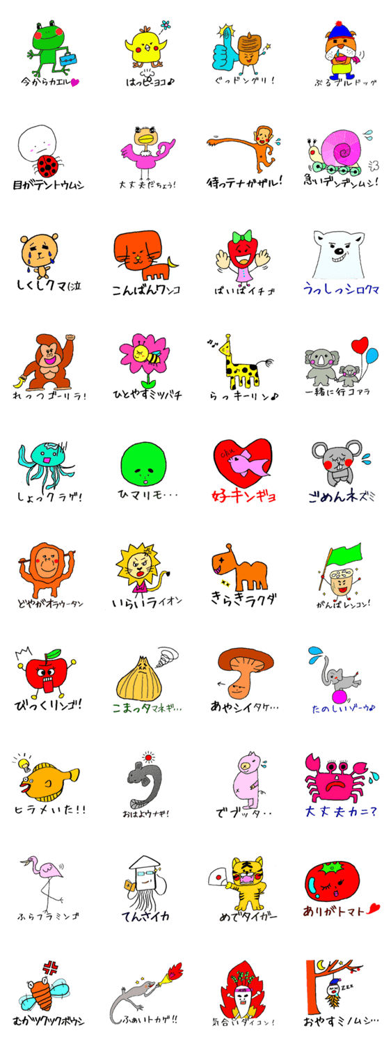 スタンプ説明 ポップでかわいい動物たちのだじゃれスタンプを描きました。お友達、家族など、仲の良い人たちと使ってくれたら嬉しいです!