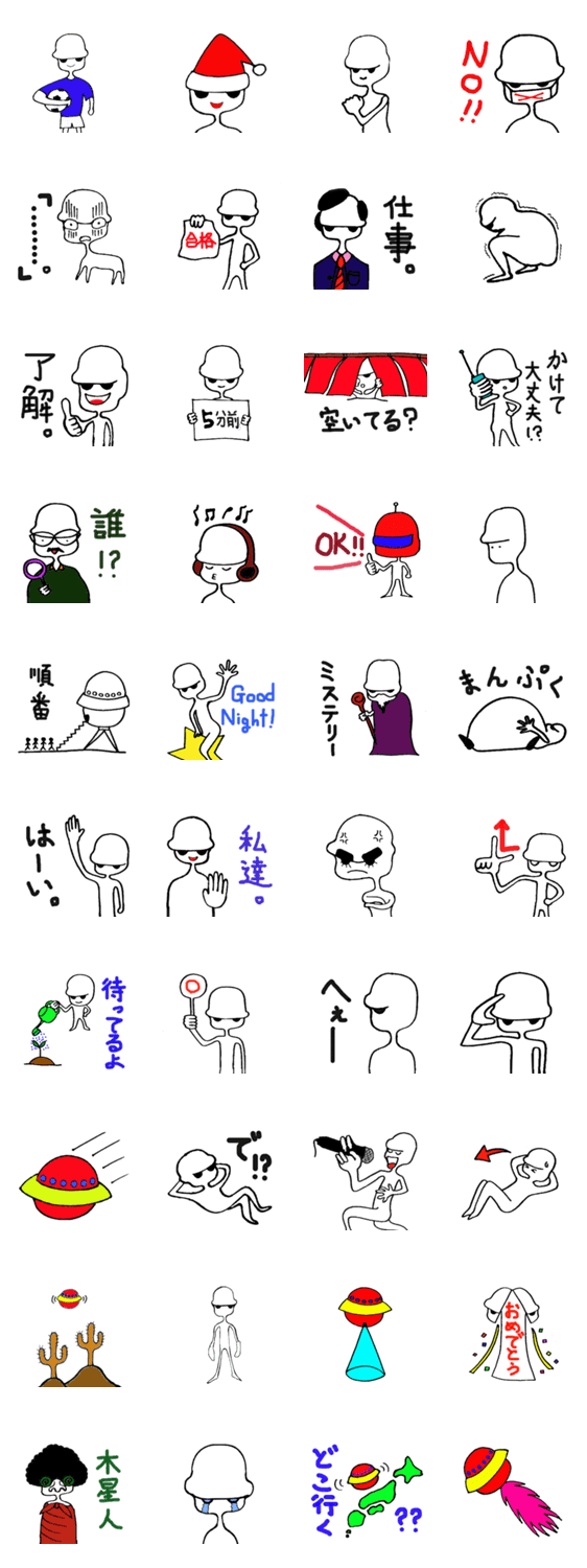 スタンプ説明 宇宙人Xが地球人の代わりに相手に思いを伝えるスタンプです。個性的で楽しめるスタンプです。是非お試しあれ!