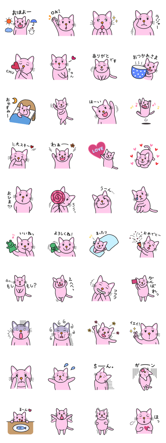 スタンプ説明 ほんわか幸せ色のももいろのネコさんスタンプ。