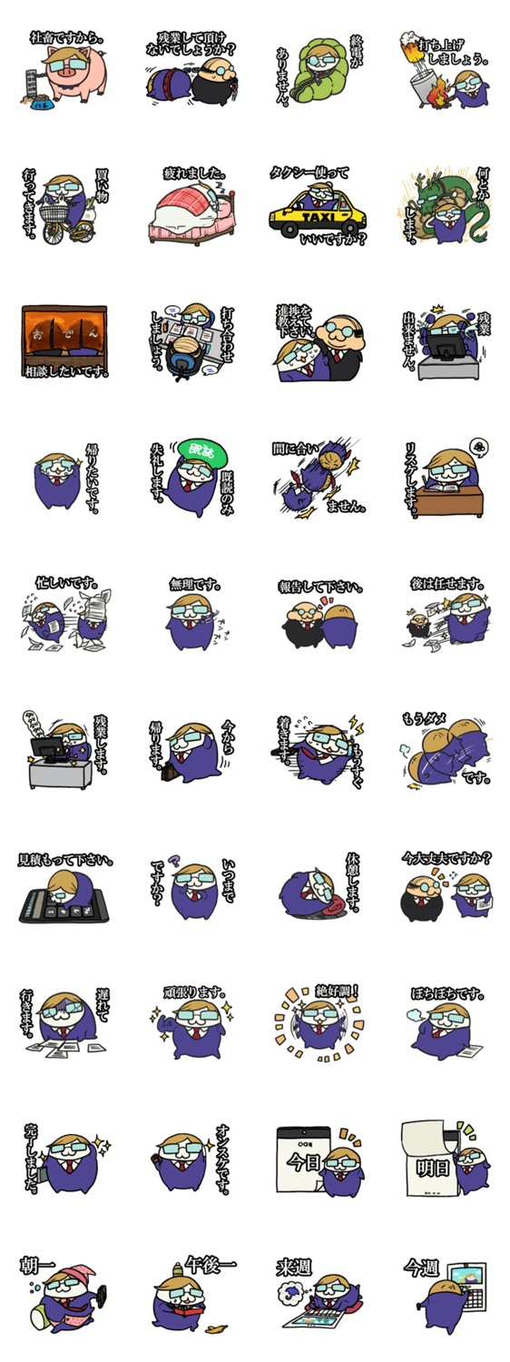 スタンプ説明 仕事が忙しくて返事を入力する時間も惜しい。でも伝えることはしっかり伝えたい。そんなサラリーマンにおすすめのスタンプ。