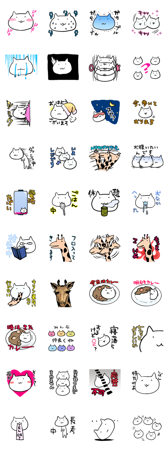 スタンプ説明 だいたい首だけのねこ、そしてきりん。カレーが好物。